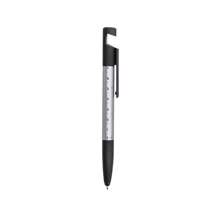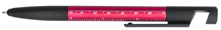 7-in-1 Dreh-Kugelschreiber in verschiedenen kräftigen Farben. Mit Ständer für Mobilgerät, Stylus, Displayreiniger, integriertem Lineal mit Skala in Zentimetern und Zoll, sowie Schlitz-und Kreuzschraubendreher. Blaue Tinte.