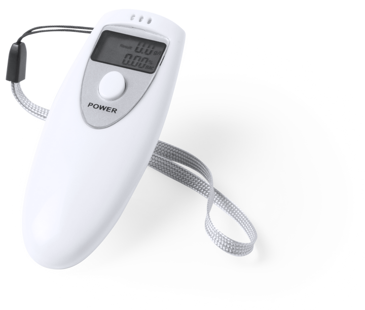 Digitaler Alkoholtester mit Messung des Atemalkoholgehalts. Mit integriertem LCD-Bildschirm, praktischer Trageschlaufe und glattem Gehäuse in Weiß - speziell für den Tampondruck entwickelt. Batteriebetrieben - 2 x AAA nicht inklusive. Mit Bedienungsanleitung in Englisch und Spanisch. Präsentiert in einer attraktiven Designbox.
