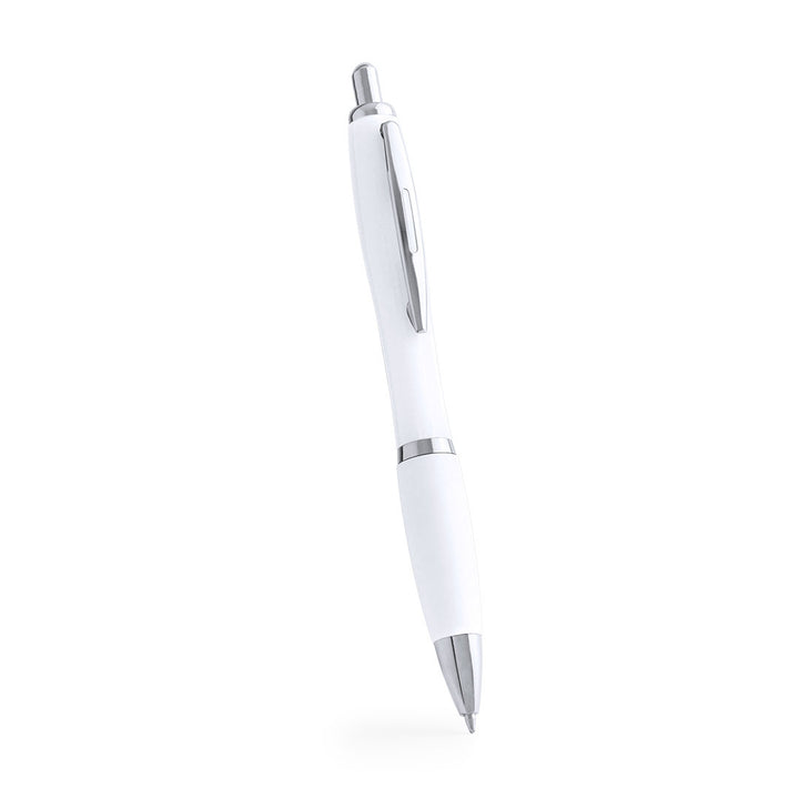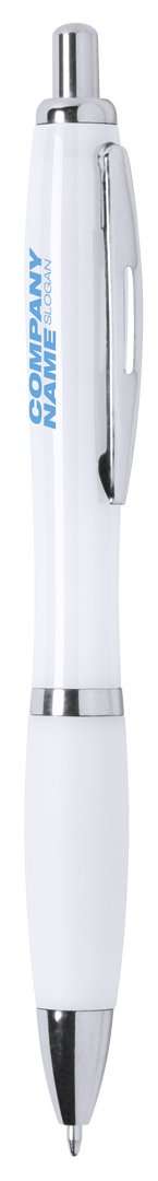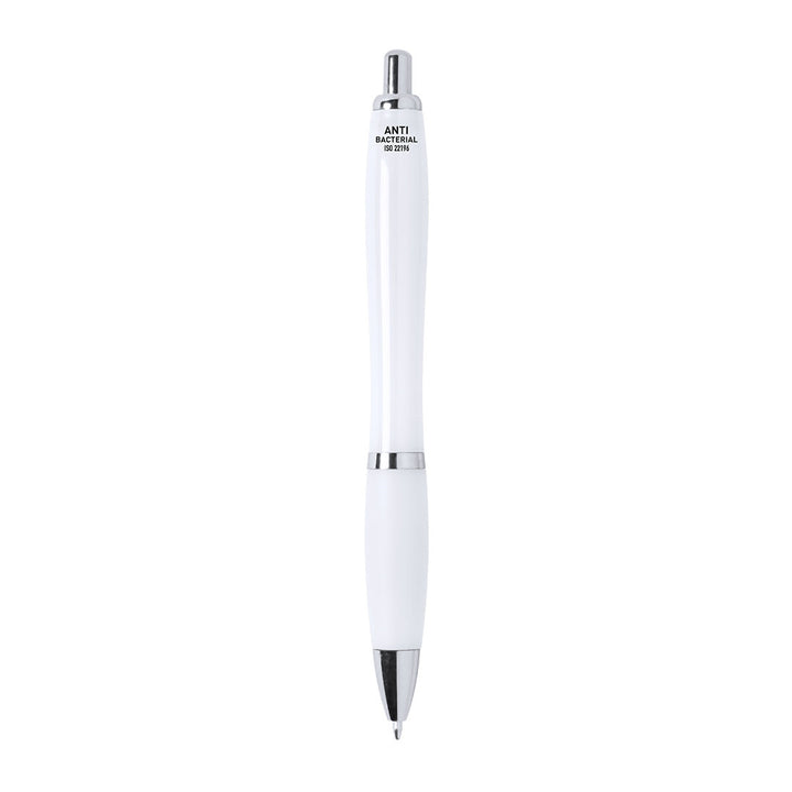 Antibakterieller Kugelschreiber. Hergestellt aus ABS-Material, das speziell verarbeitet wurde, um das Bakterienwachstum auf dem Kugelschreiberkörper durch die Nanosilbertechnologie, eine spezielle Behandlung mit Silberionen, zu hemmen und zu verhindern. Druckknopf-Mechanismus, mit Zubehör in Silberfarbe und Gehäuse in weißer Farbe. Gestanzter Clip und bequemer Griff, mit blauer Tinte. Artikel nach der Norm ISO 22196:2011, über die Messung der antibakteriellen Aktivität in Kunststoffen und anderen nicht porösen Oberflächen.