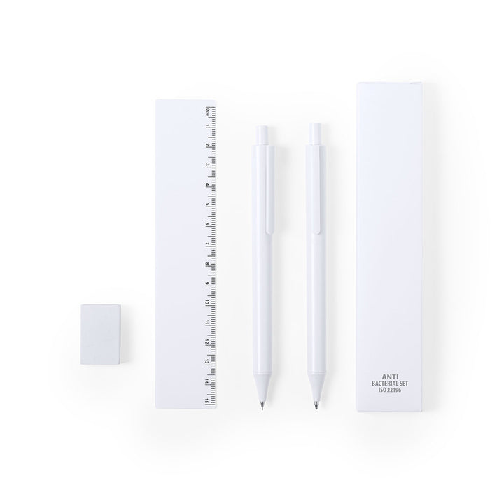Antibakterielles Set aus widerstandsfähigem weißem PP-Material. Inklusive Kugelschreiber, Druckbleistift (inklusive 0,5 mm Mine), 15 cm Lineal und Radiergummi.Druckknopfmechanik Kugelschreiber mit blauer Tinte.Die Produkte mit antibakteriellen Behandlungen sind in der Lage, die bakteriellen Belastungen auf den Oberflächen der Materialien drastisch zu reduzieren, dank der Einarbeitung von statischen permanenten mikrobiellen Wirkstoffen, mit hoher Wirksamkeit zur Hemmung und Verhinderung von bakterieller Kontamination.Artikel nach der Norm ISO 22196, der die antibakterielle Aktivität in Kunststoffen und nicht porösen Oberflächen bestimmt, was es ermöglicht, die Wirksamkeit der mikrobiellen Hemmung, die die Additive auf den behandelten Objekten haben, durch eine quantitative Bewertung zu kennen.