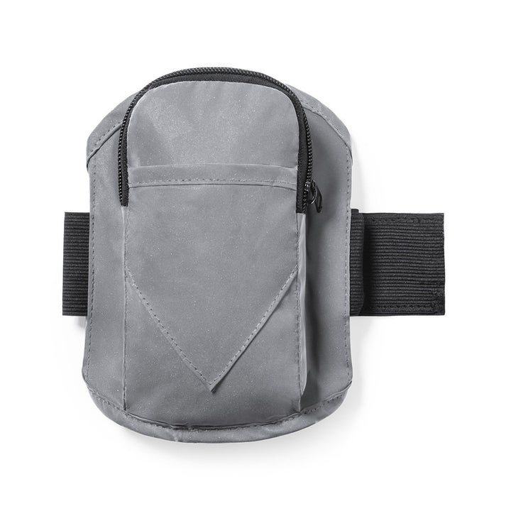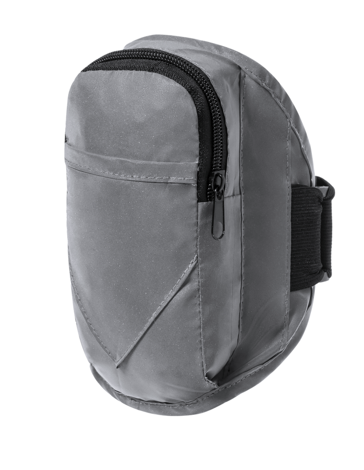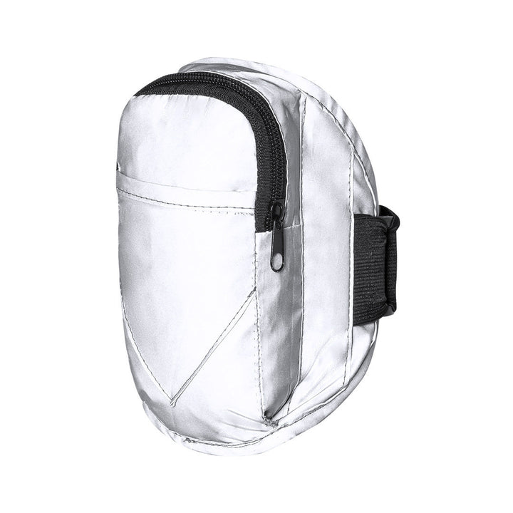 Sportarmband aus 210T Polyester, hergestellt aus Stoff mit hoher Lichtreflexionsfähigkeit, dank Millionen reflektierender Pigmente und basierend auf dem Prinzip der Retroreflexion des Lichts, einer Eigenschaft der Nachtsichtbarkeit, die aus der Brechung des Lichts in Richtung besteht die Herkunftsquelle derselben. Haupttasche mit Reißverschluss und Fronttasche mit Klettverschluss. Mit elastischem und wasserdichtem verstellbarem Riemen.