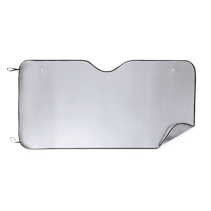 Sonnenschutz aus Aluminum in Silber-Metallic mit schwarzer Paspel. Mit den Maßen 180 x 90 cm, Gummibändern zum Fixieren im gefalteten Zustand, Metallösen zur Verstärkung, sowie zwei Saugnäpfen für die Befestigung an der Windschutzscheibe. Präsentiert in ungefaltetem Zustand für einfaches Bedrucken.