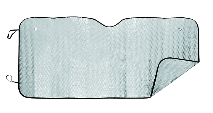 Sonnenschutz aus Aluminum in Silber-Metallic mit schwarzer Paspelierung. Maxi-Größe mit den Maßen 143 x 74 cm. Mit Gummibändern zum Fixieren im gefalteten Zustand, Metallösen zur Verstärkung, sowie zwei Saugnäpfen für die Befestigung an der Windschutzscheibe. Präsentiert in ungefaltetem Zustand für einfaches Bedrucken.