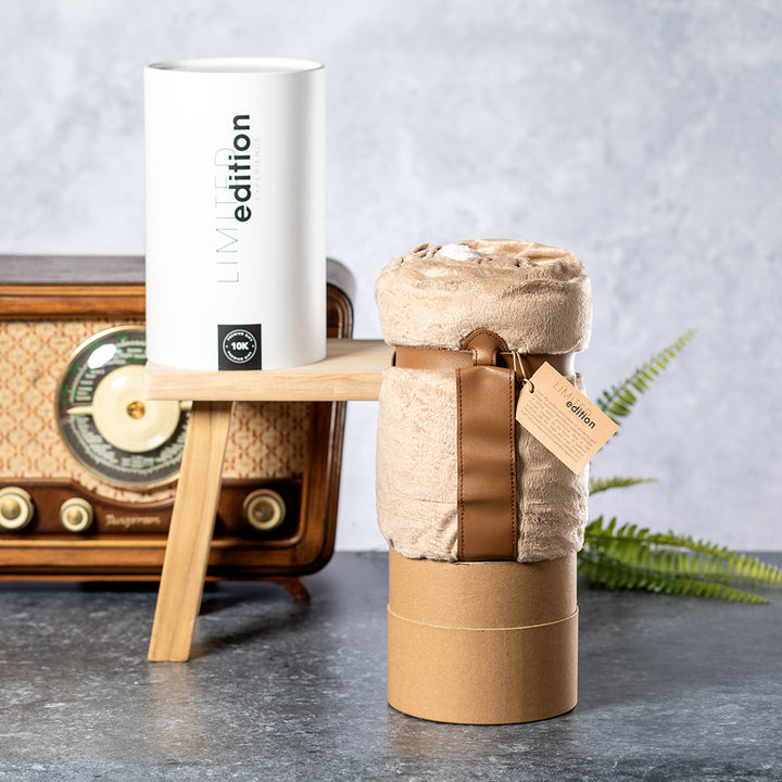 Ein besonderes Detail ist der praktische Trageriemen aus braunem PU-Leder, der Funktionalität mit einem Hauch von Luxus verbindet. Die Präsentation der Decke erfolgt in einem speziell entworfenen Etui, das durch sein einzigartiges Design die Exklusivität dieser limitierten Auflage unterstreicht. Das Etui ist zusätzlich durch gewerbliche Schutzrechte gesichert.