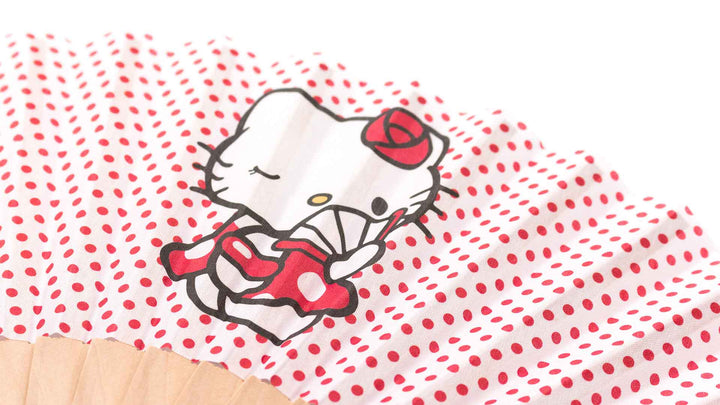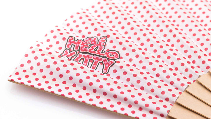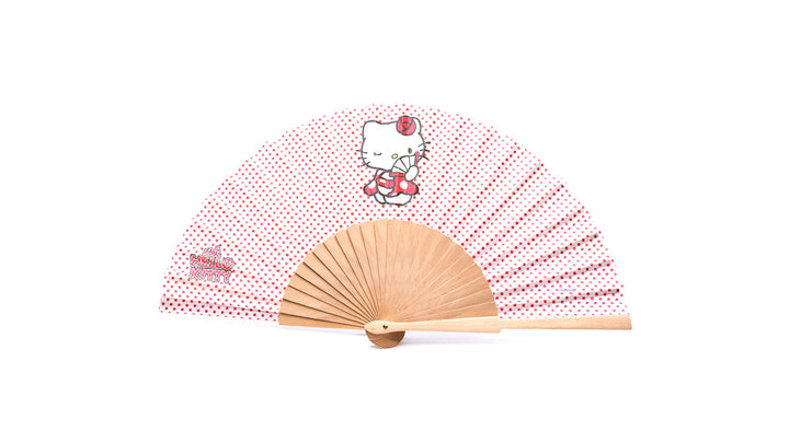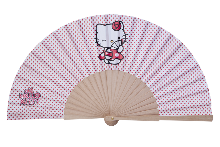 Fächer von Hello Kitty mit Stäbchen aus Naturholz und Gewebe mit originellem Design der Katze der Marke. Präsentiert in einer individuellen Box.