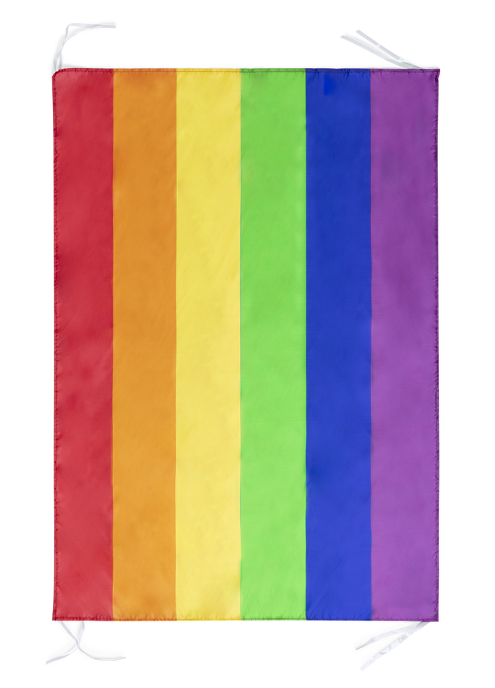 Regenbogenflagge mit mehrfarbigem Stoff aus widerstandsfähigem Polyester und Befestigungsbändern. Eine Flagge, auf die man stolz sein kann.