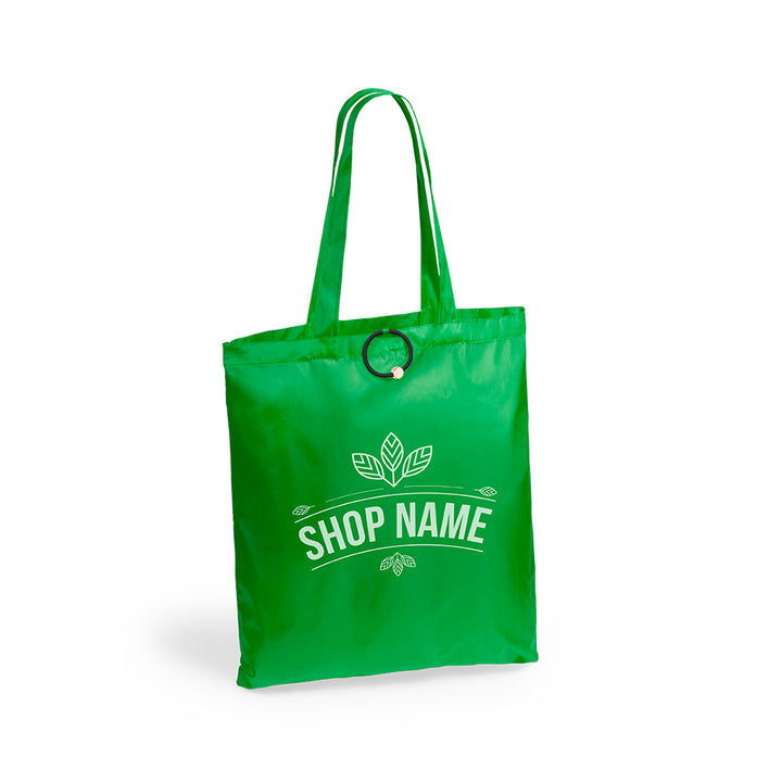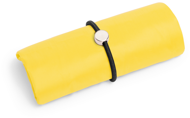 Faltbare Tasche in verschiedenen fröhlichen Farben aus weichem 190T Polyester. Mit Steppnähten und Gummiband zum Fixieren im gefalteten Zustand.
