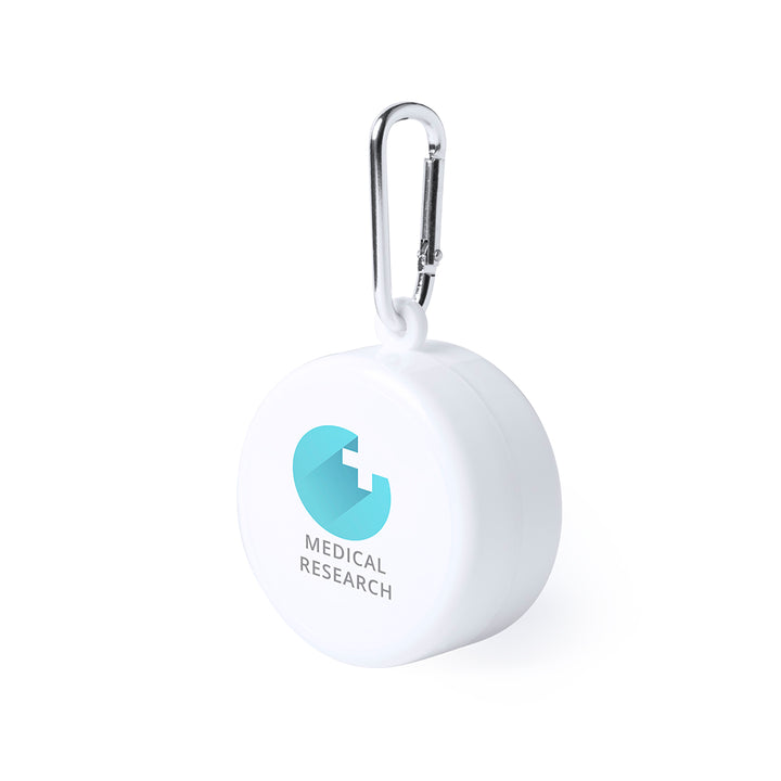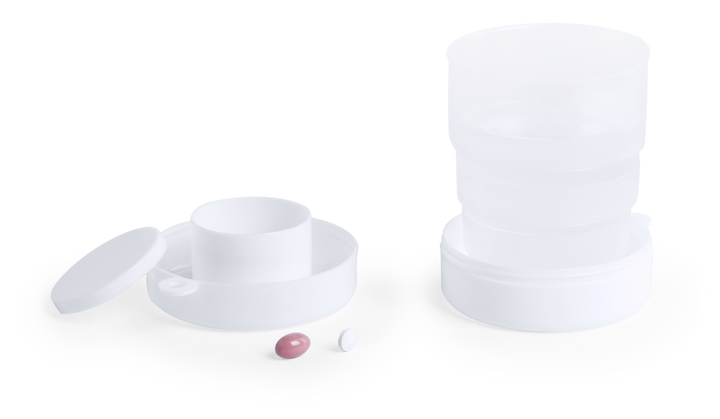 Origineller, faltbarer Notfallbecher in elegantem Weiß. Mit im Deckel integrierter Pillendose und Metallkarabiner.