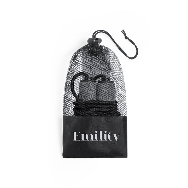Set aus Gummiband und Seil für die Sportlichsten. Enthält: 1 Band von 25x5 cm aus widerstandsfähigem TPE-Material und mittlerer Beständigkeit. 1 260 cm. langes Seil, mit Griffen aus widerstandsfähigem HIPS-Material, das mit EVA ausgekleidet ist. Präsentiert in einem Polyesterbeutel mit Kordelzugverschluss und Verstellzubehör.