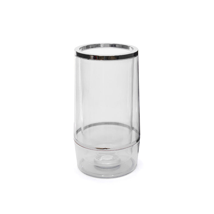 Flaschenkühler für (Wein-)Flaschen bis 750 ml in origineller transparenter Ausführung und verschiedenen Farben. Doppelwandig und mit Ringen in glänzendem Silber. Präsentiert in einer individuellen Box.