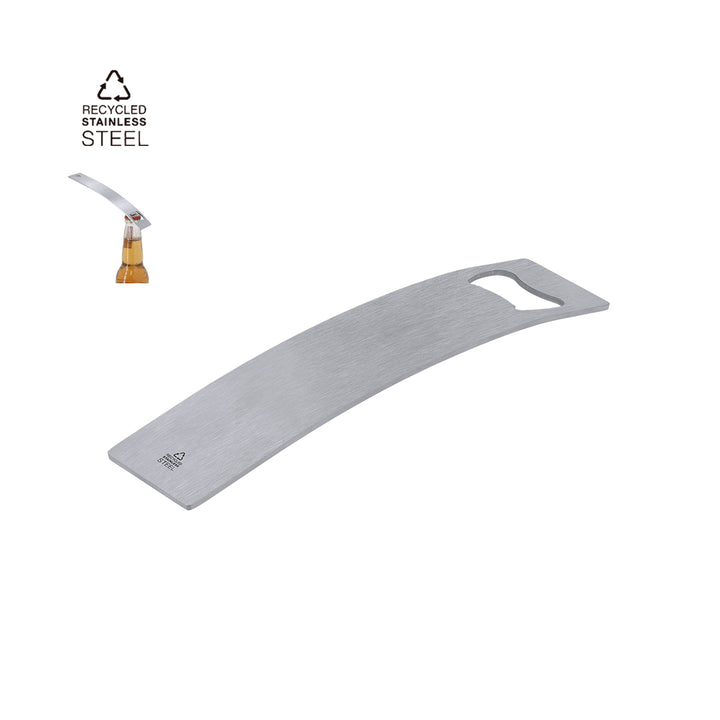 Flaschenöffner aus recyceltem Edelstahl. Enthält das Zeichen für recycelten Edelstahl.Edelstahl ist eines der am meisten nachgefragten Materialien und ist fast überall zu finden, von Alltagsprodukten bis hin zu Großkonstruktionen. Mit unzähligen Eigenschaften, unter denen Haltbarkeit und hohe Wiederverwendbarkeit hervorzuheben sind, macht es zu einer sehr geschätzten Alternative in nachhaltigen Lösungen. Bei richtiger Behandlung ermöglicht es die Gewinnung neuer Ressourcen mit unendlicher Verwendung.