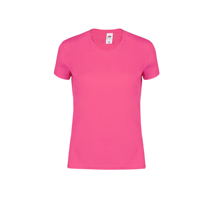 Farbiges Damen-T-Shirt Iconic von Fruit Of The Loom. Hergestellt aus 100% gebürsteter Ringspinn-Baumwolle 140g/m2. Weiches Material und schmale Passform, mit Seitennähten für eine perfekte Passform. Schmaler 1x1 gerippter Rundhalsausschnitt und passende Knopfleiste. Leicht abnehmbares Etikett und in einer breiten Farbpalette erhältlich. Größen XS, S, M, L, XL, XXL.