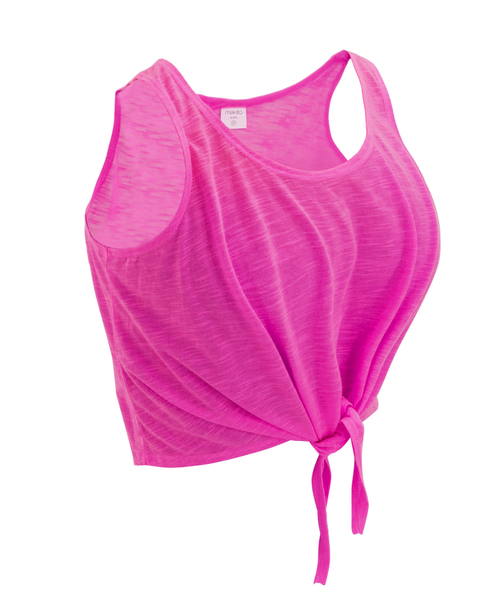 Kurzes Tanktop für Mädchen aus weichem Polyester (130 g/m2) mit Knotendetail an der Vorderseite. Erhältlich in Weiß sowie in verschiedenen kräftigen Neonfarben. In den Größen S, M und L.