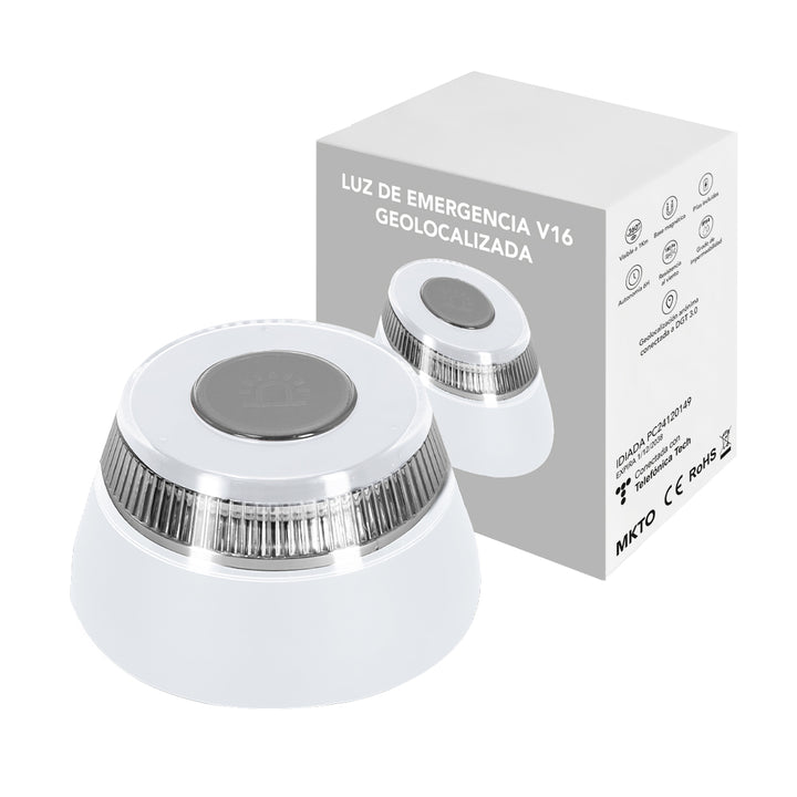 Notfalllicht V16 geolokalisiert für Fahrzeuge. Hergestellt gemäß geltenden Sicherheitsvorschriften und geprüft von dem akkreditierten Labor IDIADA, gemäß den Anforderungen der DGT, mit der Prüfnummer auf der Unterseite des Artikels. Manuelle Aktivierung und mit magnetischer Befestigungsbasis. Windbeständigkeit bis zu 180Pa, Sichtbarkeit 360° - bis zu 1 km Entfernung - und Wasserbeständigkeit gemäß IP54-Standards. Kompakte Größe zum Verstauen in jedem Fahrzeugfach und stets griffbereit im Notfall. Präsentiert in einer individuellen Designschachtel. Handbuch enthalten (Spanisch und Englisch). Betrieb mit Batterien (3xAA Alkalibatterien enthalten).Zertifikat über die Einhaltung PC24120149, ausgestellt von IDIADA, gemäß den Anforderungen der DGT.