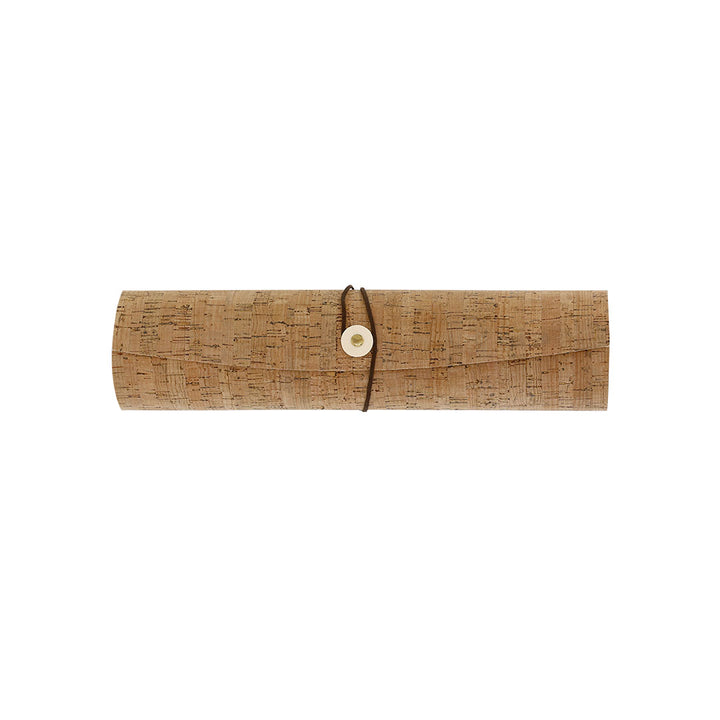 Präsentationsbox mit Innenausstattung aus Naturholz und Außenverkleidung aus Kork. Mit braunem Riemenverschluss.