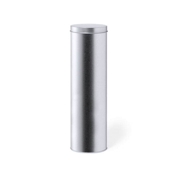 Zylindrische Präsentationsbox aus robustem, silberfarbenem Metall mit passendem Deckel.