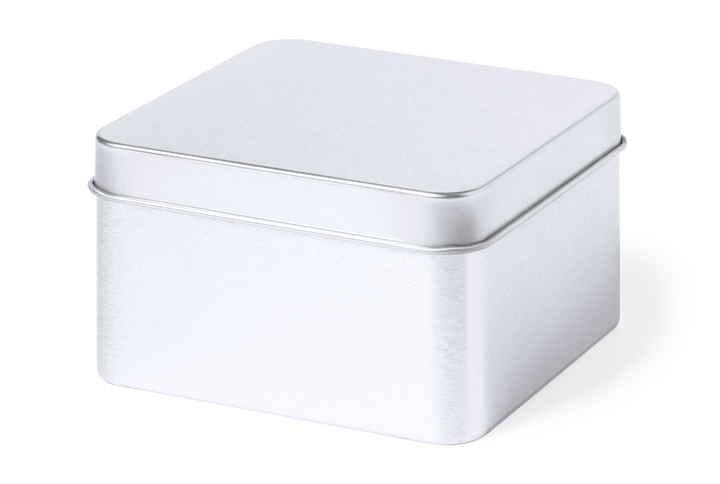 Quadratische Präsentationsbox aus robustem, silberfarbenem Metall mit passendem Deckel.