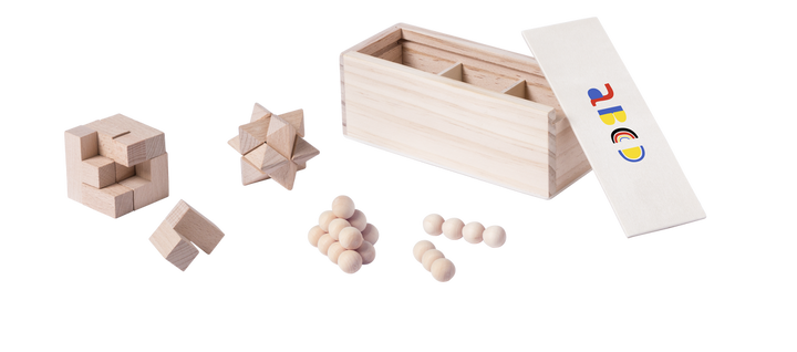 Set aus 3 Geschicklichkeitsspielen aus Naturholz. Präsentiert in einer Holzkiste mit 3 Innenfächern und Schiebedeckel.