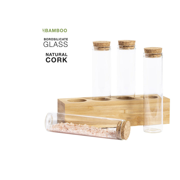 Das Set umfasst vier Gläser aus Borosilikatglas mit einem Fassungsvermögen von jeweils 70 ml. Borosilikatglas zeichnet sich durch außergewöhnliche Festigkeit und Haltbarkeit aus und kann unzählige Male wiederverwendet werden. Die Gläser sind mit Naturkorkdeckeln und einem Boden aus Bambus versehen, um den Einsatz von natürlichen Rohstoffen zu fördern.
