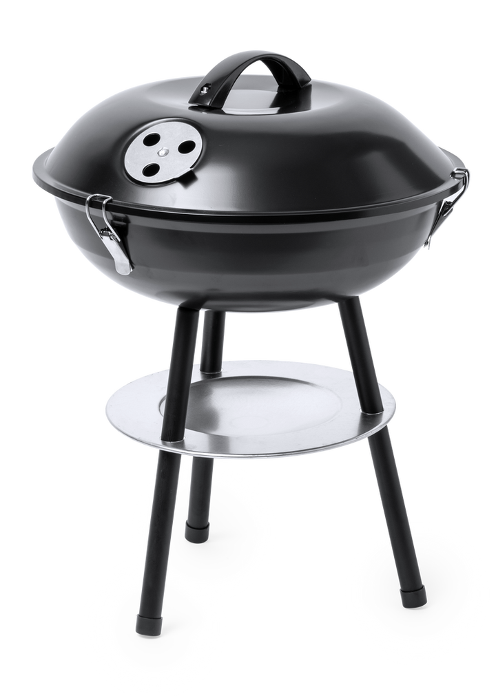 Grill aus widerstandsfähigem Kohlenstoffstahl mit schwarzer Oberfläche. Deckel mit komfortablem Griff und Lüftungslöchern, mit Metallgitter, Tropfschutzplatte und rutschfesten Füßen. Präsentiert in einer attraktiven Designbox.