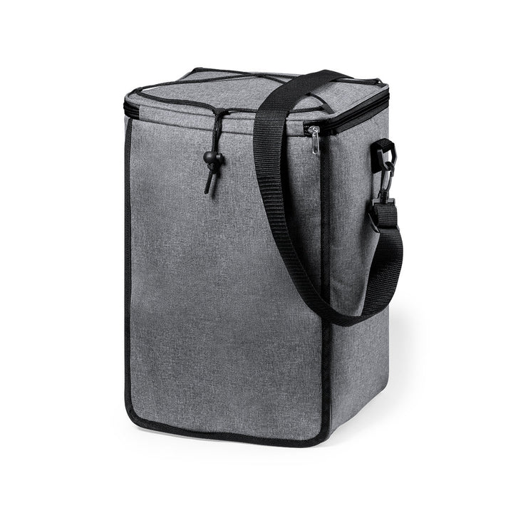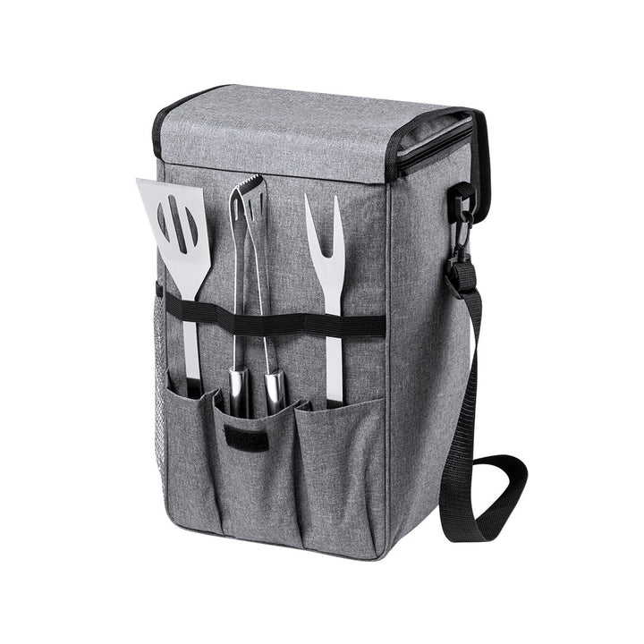 Grillset mit 3 Zubehörteilen. Einschließlich: Tragetasche/Kühlbox aus widerstandsfähigem RPET 300D-Polyester, hergestellt aus recyceltem Kunststoff, der die Wiederverwendung von Kunststoffabfällen fördert und zur Nachhaltigkeit unseres Planeten beiträgt. Mit verstellbarem Schultergurt und Karabinerhaken, einschließlich isothermischem PEVA-Innenraum, um das Essen auf der richtigen Temperatur zu halten. RPET-Logo auf dem Außenetikett.Spatel, Zange und Gabel aus Metall, mit schwarzen Griffen.