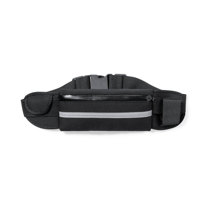 Hochwertige Bauchtasche aus strapazierfähigem Softshell (Neopren), mit reflektierendem Streifen. Hauptfach mit Reißverschluss, elastischem Flaschenhalter und Tasche für Schlüssel und andere Kleinigkeiten. Mit Schnallenverschluss und verstellbarem Riemen, speziell für Sport- und Freizeitaktivitäten konzipiert.