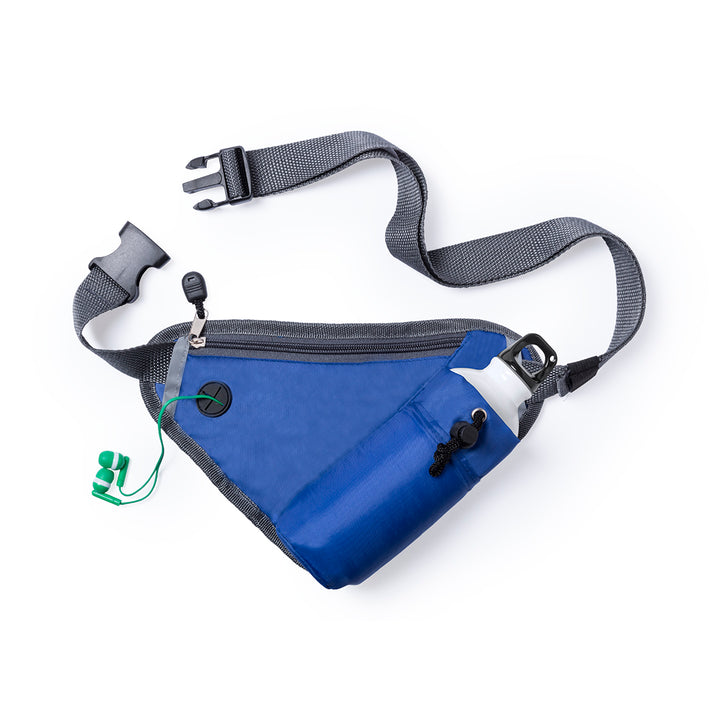 Bauchtasche mit dreieckigem Design aus weichem 210D Polyester in verschiedenen Farben. Entwickelt für Sport- und Freizeitaktivitäten. Mit Reißverschlussfach, Kopfhörerausgang, verstellbarer Flaschentasche und verstellbarem Gurt mit Klickverschluss. Flasche nicht inklusive.