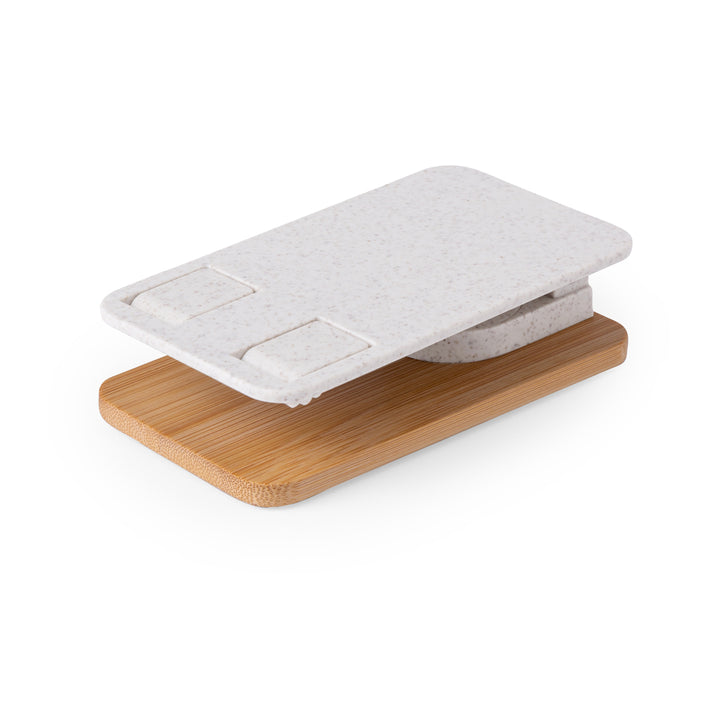 Faltbarer Halter für Smartphones und Tablets, aus Weizenstroh mit widerstandsfähigem Bambusgrund. Höhenverstellbar, mit rutschfesten Gummiauflagen an Fuß und Halterung. Große Branding-Oberfläche, besonders geeignet für Tampondruck auf dem Halter und Laserdruck auf der Basis.Materialien wie Bambus fördern die Verwendung natürlicher Rohstoffe und reduzieren die Schadstoffemissionen. Es stammt von einer sehr widerstandsfähigen und vielseitigen Pflanze mit schnellem Wachstum und Regeneration, was es zu einer ausgezeichneten Alternative zu traditionellem Holz macht.Weizenstroh fördert die Verwendung natürlicher Rohstoffe und reduziert so die Schadstoffemissionen.
