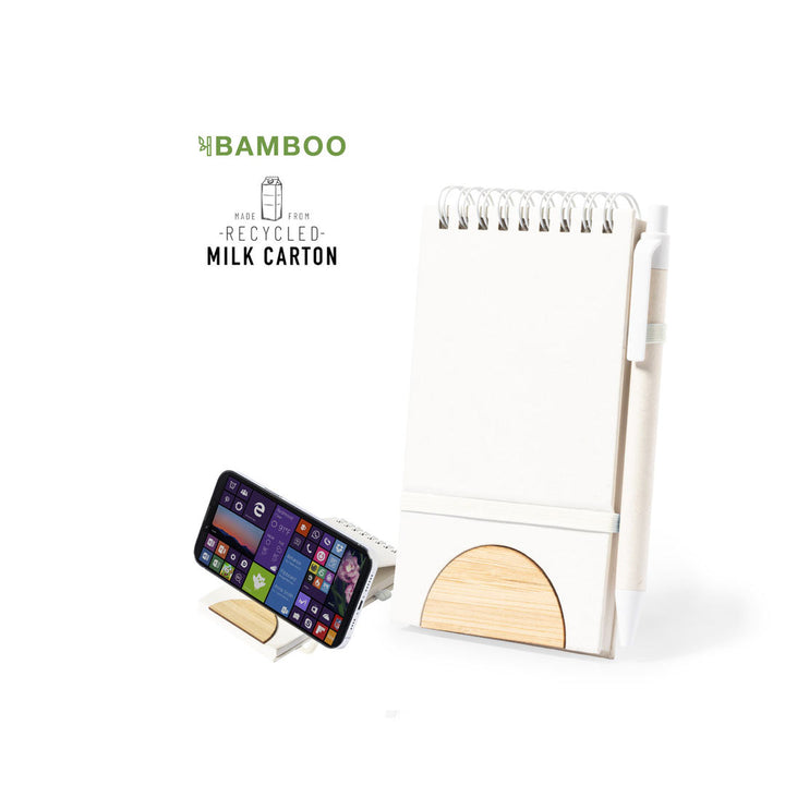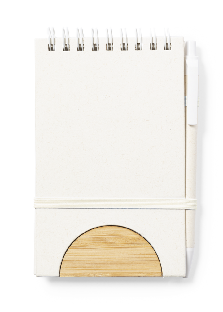 Das Notizbuch besitzt eine stabile Hardcover-Abdeckung, die mit Bambusdetails veredelt wurde und dem Produkt eine natürliche, moderne Ästhetik verleiht. Ein praktisches Gummiband sorgt nicht nur für einen sicheren Verschluss, sondern kann auch als Stifthalter genutzt werden. Innen bietet das Notizbuch 80 linierte Seiten, die ausreichend Platz für Notizen und Gedanken bieten. Auf der Rückseite der Seiten befindet sich das charakteristische Logo aus recyceltem Milchkarton, das den nachhaltigen Ansatz dieses Produkts unterstreicht.