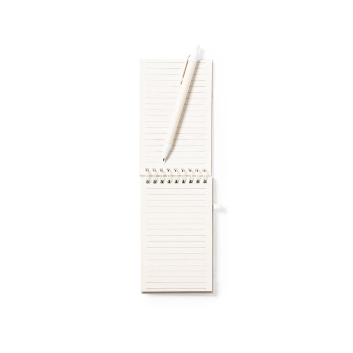 Das Notizbuch wird zusammen mit einem Kugelschreiber geliefert, der ebenfalls aus recycelten Milchkartons gefertigt ist. Der Kugelschreiber verfügt über einen praktischen Druckknopfmechanismus und verwendet blaue Tinte. Auf der Oberseite des Stifts ist ein Abzeichen aus recyceltem Milchkarton angebracht, was das nachhaltige Design weiter hervorhebt.