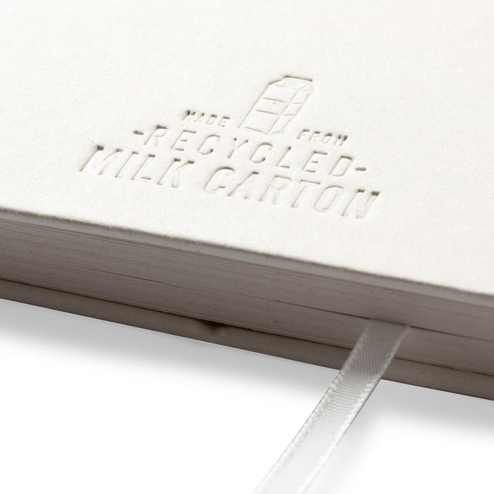 Dank des Materials aus recycelten Milchkartons – einer Mischung aus Pappe und Aluminium – profitiert das Notizbuch von einer stabilen Struktur und einer hohen Wiederverwertbarkeit. Dieses Material trägt aktiv zur Kreislaufwirtschaft bei und bietet eine umweltfreundliche Alternative zu herkömmlichen Produkten. Material: