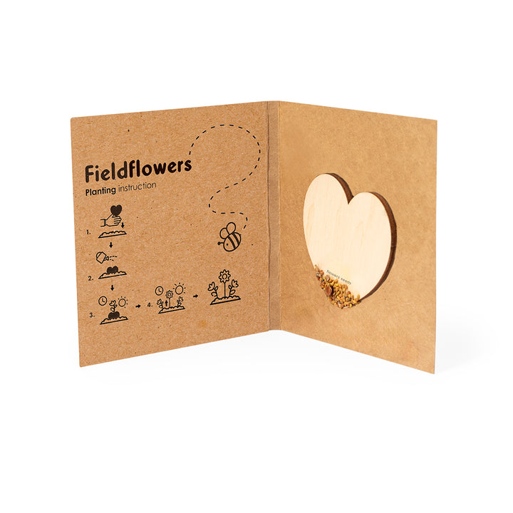 Samenherz aus natürlichem Holz, mit Wildblumensamen, bereit zum Einpflanzen. Präsentiert in einer eleganten Karte aus recyceltem Karton, mit Pflanzanleitung und großer Beschriftungsfläche.