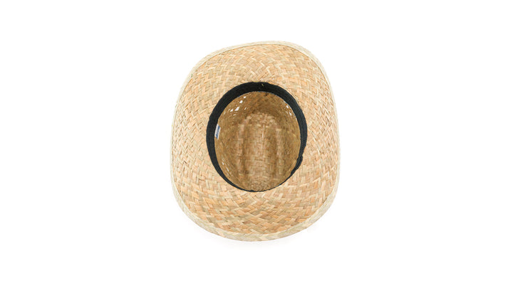 Strohhut. Er ist aus geflochtenem Stroh in natürlicher grüner Farbe hergestellt und durch seine Machart atmungsaktiv. Er hat ein Innenband, um ihn bequemer zu machen.