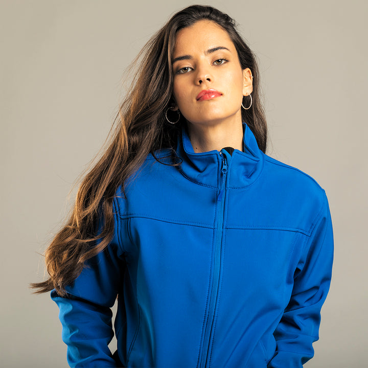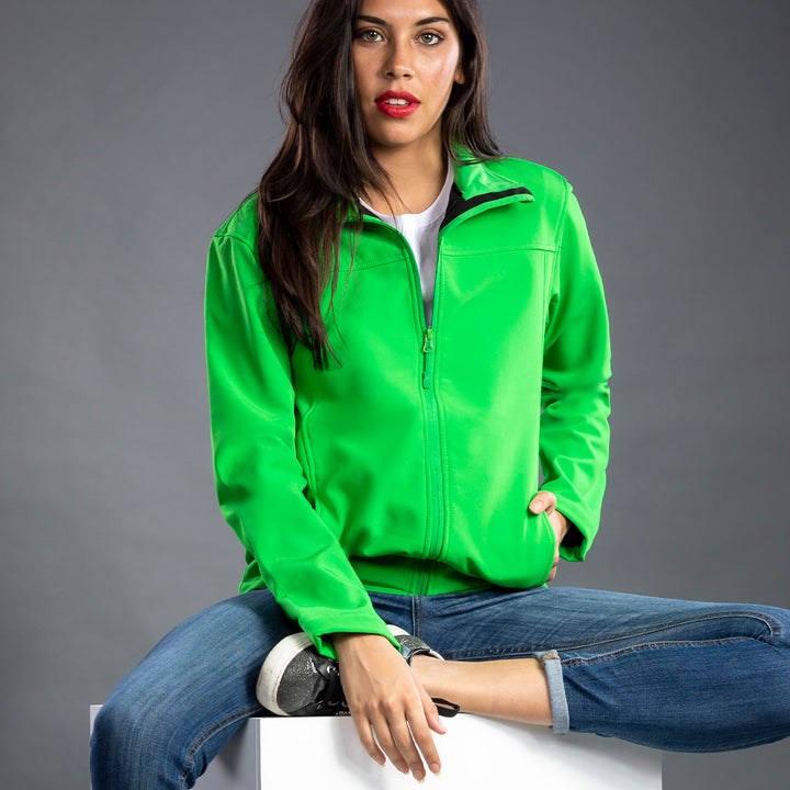 Wasserabweisende und atmungsaktive Jacke aus einer Soft-Shell/Elasthan-Kombination (300 g/m2). Mit Reißverschluss und Seitentaschen. Verfügbar in verschiedenen kräftigen Farben und den Größen S, M, L, XL und XXL.