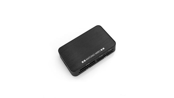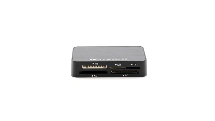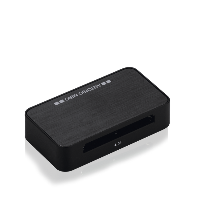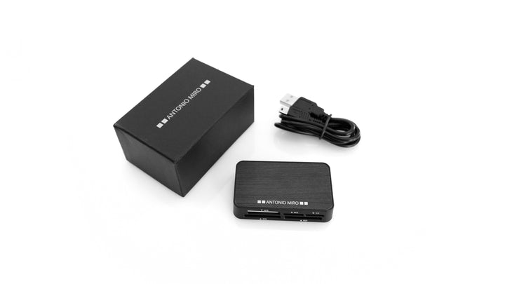 Kartenleser von Antonio Miró aus elegantem schwarzem Aluminium. Kompatibel mit MS-, M2-, TF-, XD-, SD- und CF-Karten. Präsentiert in einer individuellen Box mit dem Markenlogo und weichem, gestanztem Schaumstoff im Inneren.