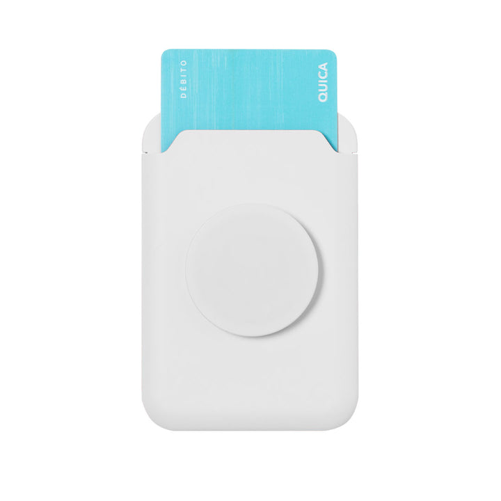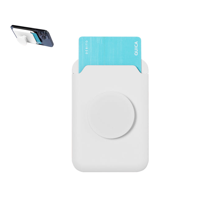 Visitenkartenetui mit klappbarem Smartphone-Halter. Entworfen, um bis zu zwei Karten aufzubewahren, enthält einen haftenden Metallring für eine sichere Befestigung und einen abnehmbaren und verstellbaren Ring für eine bessere Nutzung in glänzendem Braun.