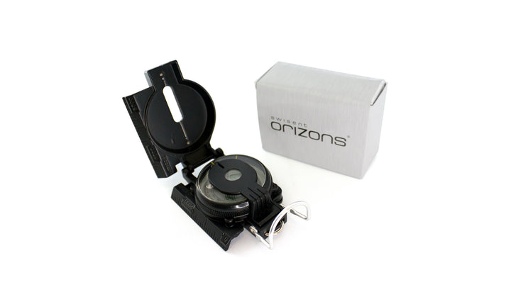 Hochpräziser Kompass von Orizons mit robustem Aluminiumgehäuse und Befestigungsclip. Präsentiert in einer attraktiven Designbox mit dem Markenlogo.