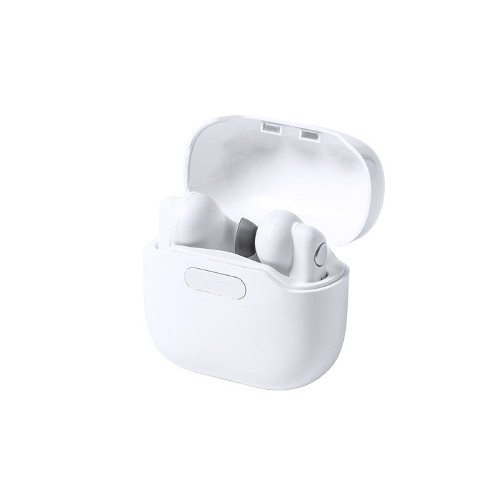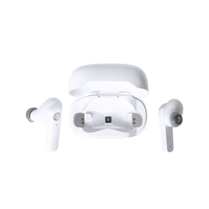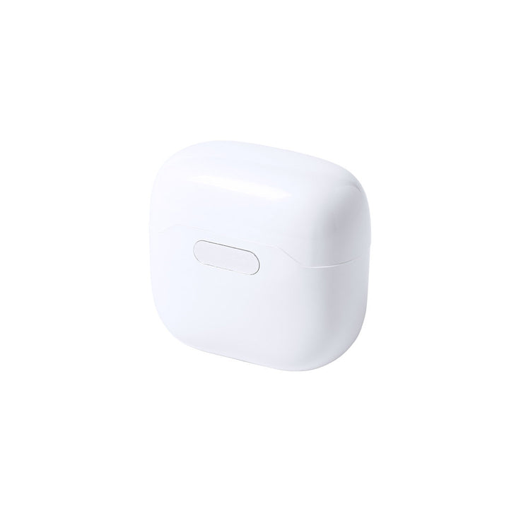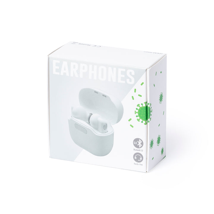 In-Ear-Kopfhörer in elegantem Weiß und mit Bluetooth 5.0-Anschluss. Innenraum mit ultraviolettem Licht Typ C, besonders geeignet für die Beseitigung von Mikroorganismen und Bakterien. Ergonomisches Design, einschließlich der in der Hörmuschel integrierten Bedientaste, mit passender Basis. Freisprechfunktion und wiederaufladbar über Micro-USB-Kabel (im Lieferumfang enthalten). Präsentiert in einem hochwertigen, mit Scharnieren zu öffnenden Einzeletui in einer attraktiven Designerbox, mit Bedienungsanleitung in Englisch und Spanisch.