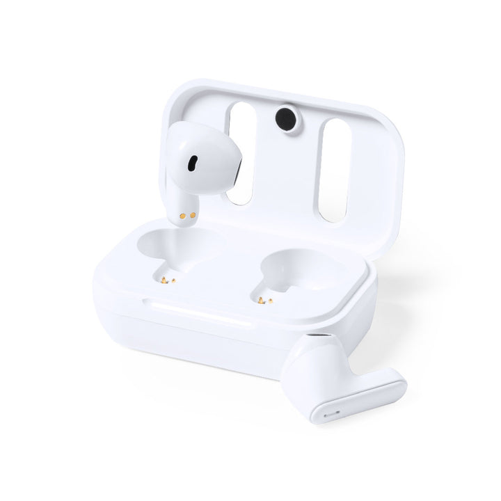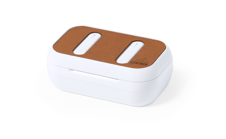 Auriculares intraurales Bluetooth®, fabricados en RABS y en elegante color blanco, con la tapa de la base de carga forrada en cuero reciclado.Conexión Bluetooth® 5.1, función manos libres y batería de 30 mAh. De diseño ergonómico, incluyen botón de control táctil integrado en cada auricular y luz LED de estado de carga. Base de carga a juego, con batería de 300mAh. Incluye cable cargador Tipo C y manual de instrucciones en español e inglés. Presentado en caja individual de diseño kraft.El material RABS o ABS Reciclado y el cuero reciclado proceden del reciclado de artículos al final de su vida útil. Los materiales reciclados empleados incorporan la certificación RCS, que garantiza el origen reciclado de los mismos.