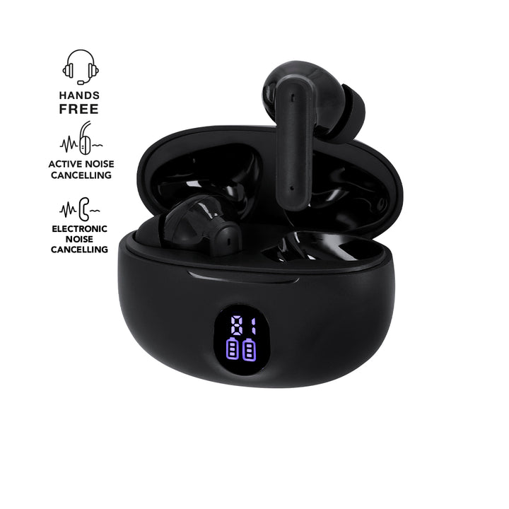In-Ear-Kopfhörer mit Bluetooth® 5.4 Verbindung, Freisprechfunktion und Geräuschunterdrückung. Ergonomisches Design, enthalten Tasten mit integrierter Touch-Steuerung im Ohrhörer, mit passendem Ladebasis und externer Batterieanzeige pro Ohrhörer. Integrierte Batterie von 230 mAh. Bedienungsanleitung in Spanisch und Englisch.