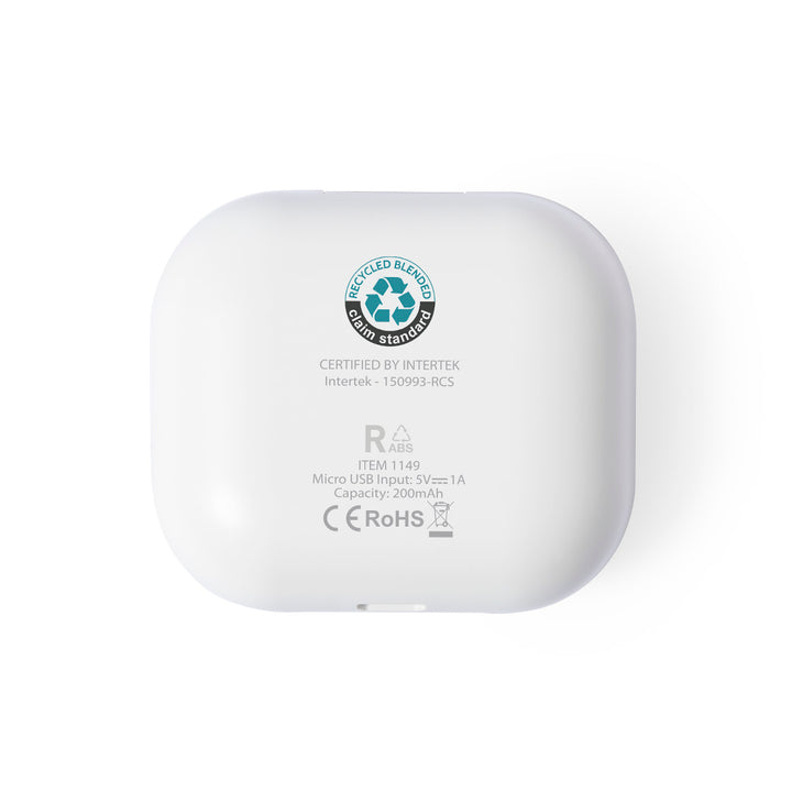 In-Ear-Kopfhörer der Nature-Line und Bluetooth 5.0-Anbindung, mit Lithium-Akku und in edlem weißen Finish. Hergestellt aus recyceltem ABS (RABS) und RCS-zertifiziert, was seine recycelte Herkunft garantiert. Sie sind ergonomisch gestaltet und verfügen über einen in das Headset integrierten Bedienknopf mit passender Ladestation und LED-Ladezustandsanzeige. Freisprech- und wiederaufladbare Funktion mit mitgeliefertem Micro-USB-Kabel. Präsentiert in einer attraktiven Öko-Designbox.