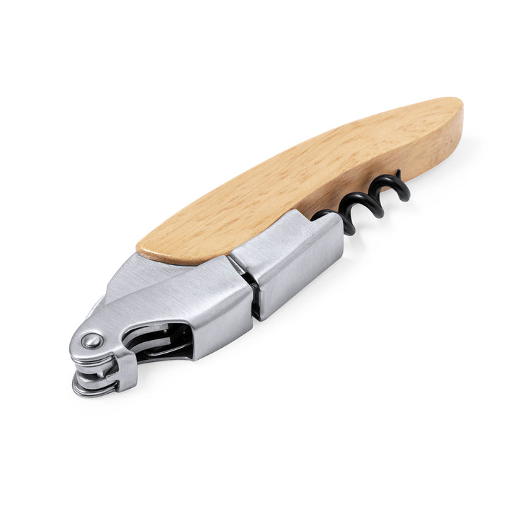Korkenzieher aus Edelstahl, mit weichem Holzgriff und integriertem Kapselschneider. Präsentiert in einer individuellen Kraft-Designbox.