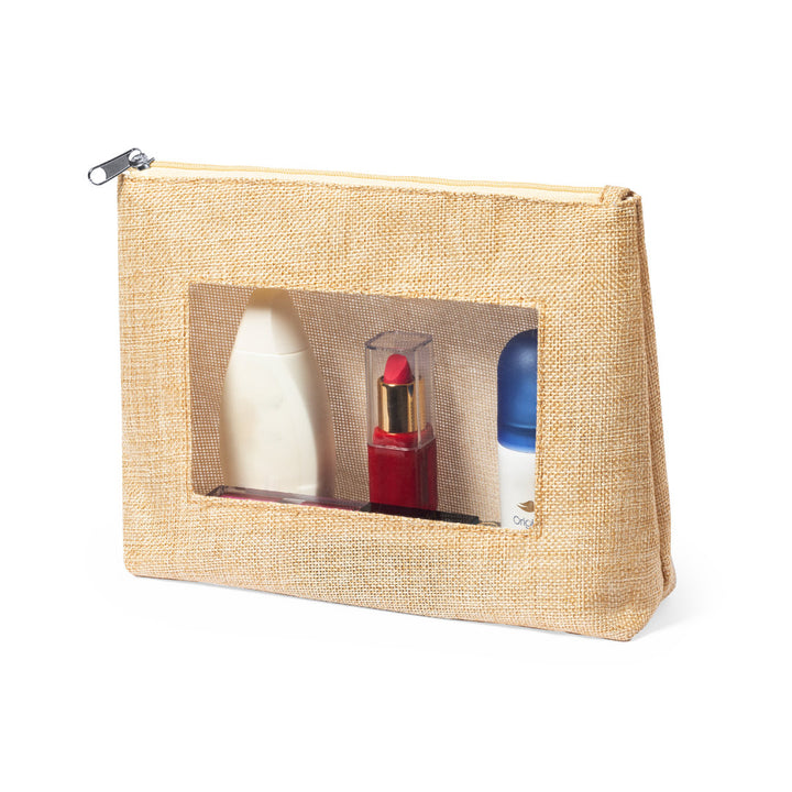 Von der Natur inspirierte Kulturtasche mit Sichtfenster auf einer Seite. Mit passendem Reißverschluss und genähtem Abschluss. Hergestellt aus ecrufarbenem Polyester, mit transparentem EVA-Fenster.