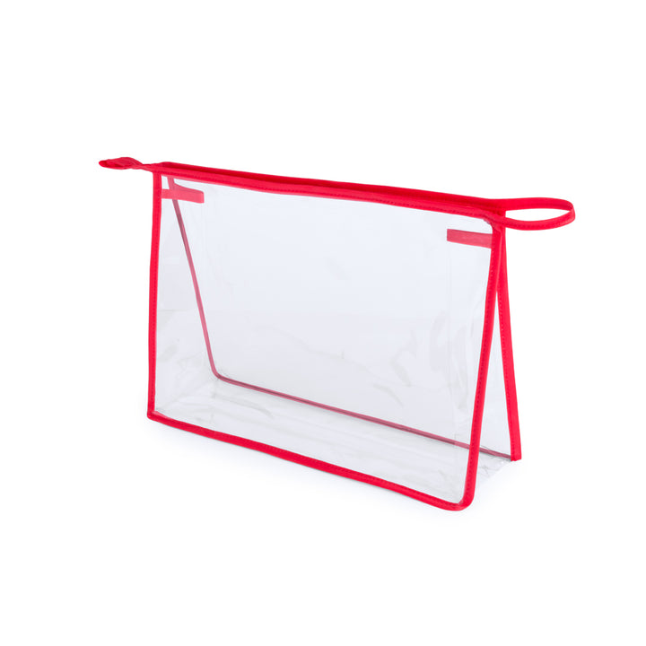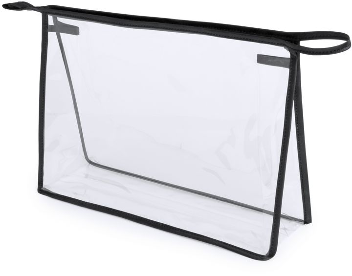 Vielseitig verwendbare Tasche aus robustem, transparentem PVC mit Paspel in lebendigen Farben. Mit Reißverschluss und farblich passendem Tragegriff.