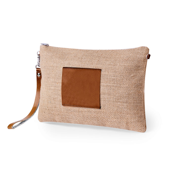 Mehrzweck-Kosmetiktasche aus einer Kombination aus laminierter Jute und PU-Leder. Mit Reißverschluss, Metallgriff und passendem Mittelrahmen aus naturfarbenem PU-Leder. Präsentiert in einer individuellen Tasche.