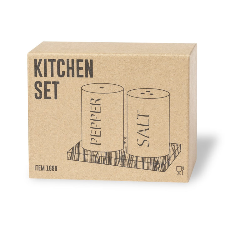 Set aus Salz- und Pfefferstreuern in Weiß und aus Keramik. Inklusive Sockel aus natürlichem Akazienholz, passend zu den Salz- und Pfefferstreuern gestanzt. Präsentiert in einer individuellen Kraft-Design-Box.
