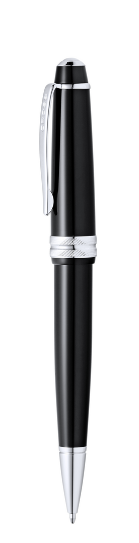 Kugelschreiber Cross Bailey Light, kombiniert ein hochglänzendes Harz mit einem polierten Chrom, metallisches Finish. Jumbo-Patrone in schwarzer Tinte. Präsentiert in einem eleganten, schwarzen Etui mit Markenlogo und weichem Wildlederfutter.