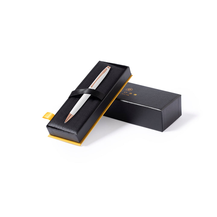Kugelschreiber mit einziehbarem Mechanismus, auffälliges zweifarbiges Design in Weiß mit eleganten roségoldenen Akzenten. Metallgehäuse mit glatter Oberfläche und originellem Clip mit Logo. Präsentiert in einem eleganten schwarzen Einzelgehäuse mit dem Logo der Marke und einem passenden, weichen, wildlederähnlichen Innenraum. Mit schwarzer Tinte.