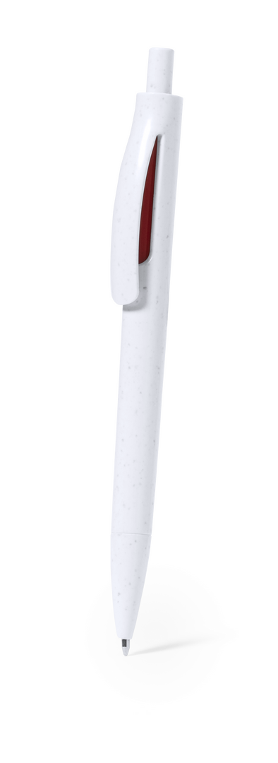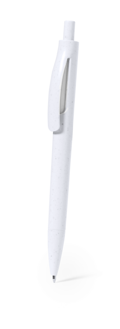 Kugelschreiber mit Druckknopfmechanismus aus recyceltem ABS. Mit farbenfrohen Beschlägen und einem glatten, weißen Schaft. Abzeichen aus recyceltem ABS auf der Oberseite des Stiftes. Mit blauer Tinte.
