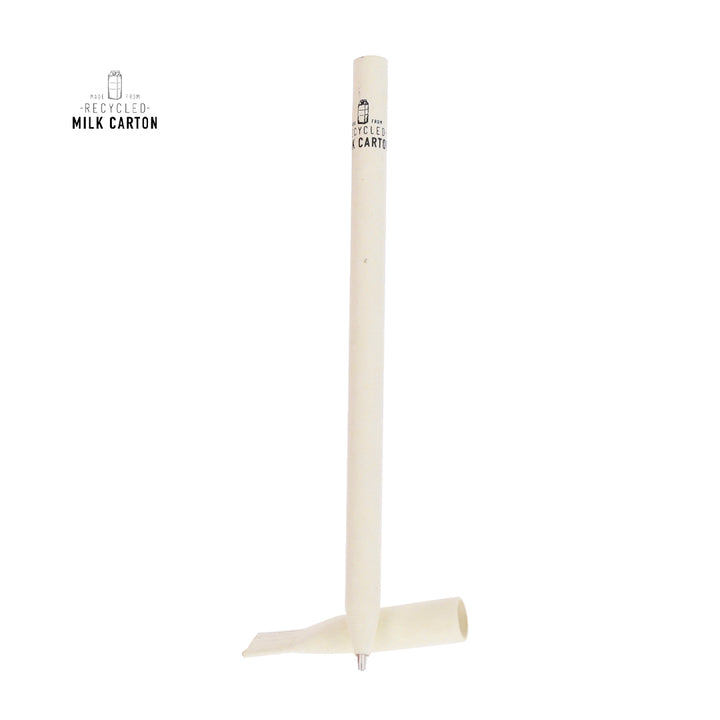 Kugelschreiber mit einem Gehäuse, das aus recycelten Milchkartons und weißen Akzenten besteht. Mit Druckverschluss und blauer Tinte, mit einem Merkmal für recycelten Milchkarton am Gehäuse.Milchkartons bestehen größtenteils aus Karton und Aluminium. Bei ihrem Recyclingprozess werden die verschiedenen Materialien des Behälters getrennt für ihre Wiederverwendung und neuen Einsatz, wodurch der endlose Weg der Kreislaufwirtschaft gefördert wird. Dieses Material zeichnet sich durch seinen hohen Recyclinggrad, sein leichtes Gewicht und seine Widerstandsfähigkeit aus.